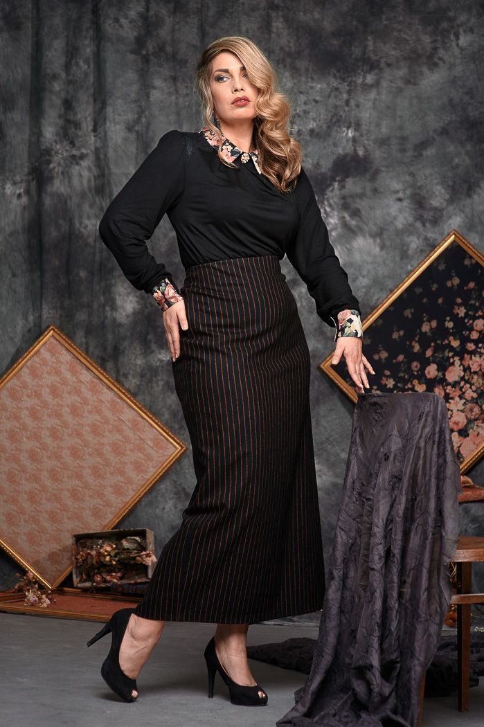 Трикотажная блузка свободного кроя с воротником и длинным втачным рукавом. Внизу рукава манжет из цветного шелка,застегивается на 2 пуговицы и петли. Воротник сложный,на отрезной стойке. Верхний воротник из цветного шелка, присобран по внутреннему срезу складочками, по передней части из-под стойки еще маленький воротничок из двух частей из основной ткани с кружевом. Горловина переда в центральной части заложена глубокими складками, украшена кружевными плечевыми кокетками, сзади слезка и застежка на 1 пуговку и навесную петлю. Подгибка низа широкая. Дополнительным декором служит брошь. Длина блузы 67 см, рукава 64 см.